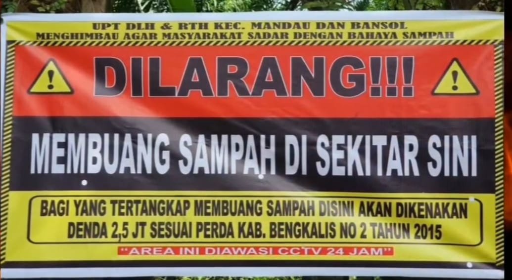 Wujud ketegasan Camat Mandau , plang imbauan dipasang di lokasi. Bagi yang kedapatan membuang sampah bakal diamankan dan dikenakan sanksi berupa denda Rp2,5 juta.