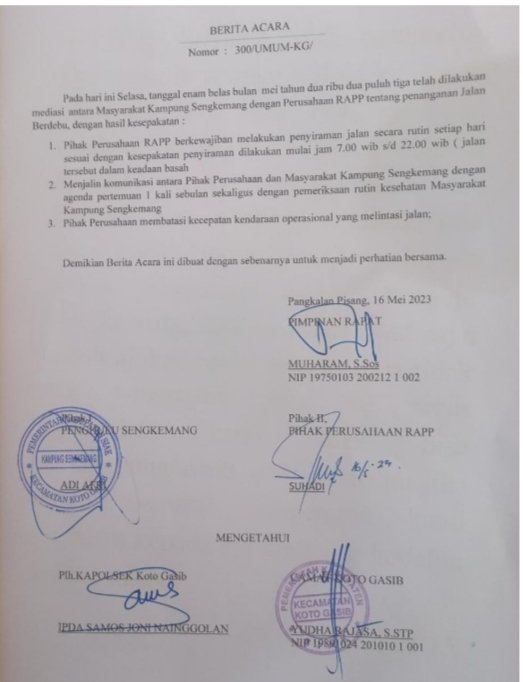 Dalam kesempatan ini pihak PT.RAPP dan Masyarakat Kampung Sengkemang mengadakan kesepakatan Tetang penanganan jalan berdebu dan inilah hasil kesepakatan nya, sebagai berikut: