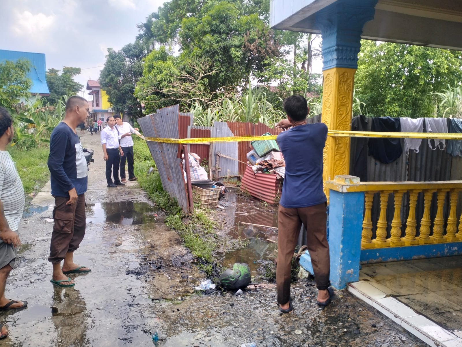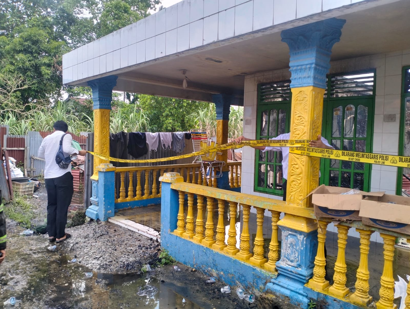 | Kondisi Rumah di Kelurahan Perawang Siak yang didalamnya habis dibakar sang anak yang diduga stres gangguan jiwa |