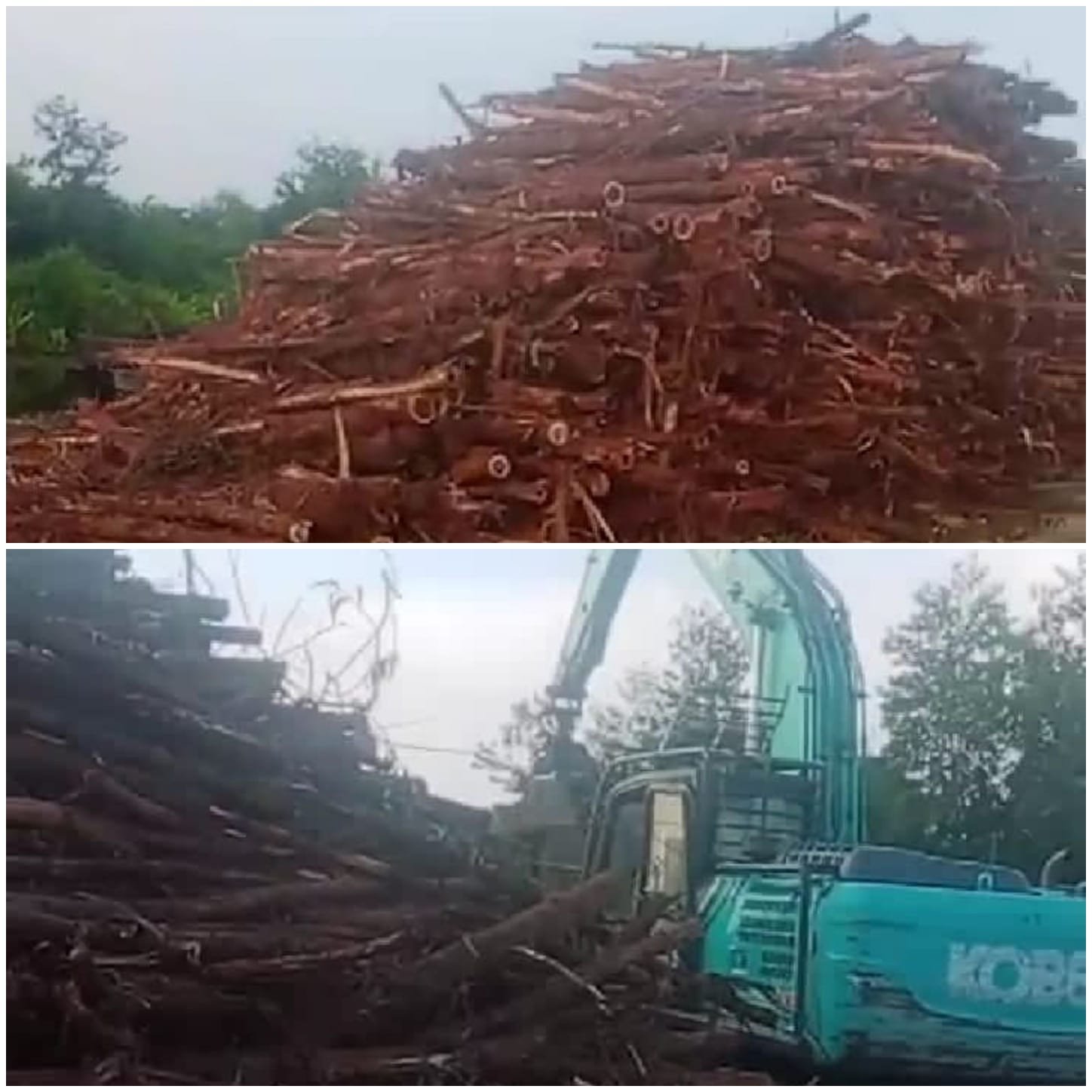 | Photo tumpukan kayu akasia di Distrik Pusako PT. Arara Abadi dari lahan Tora tanpa adanya surat kuasa panen dari masyarakat pemilik SHM |