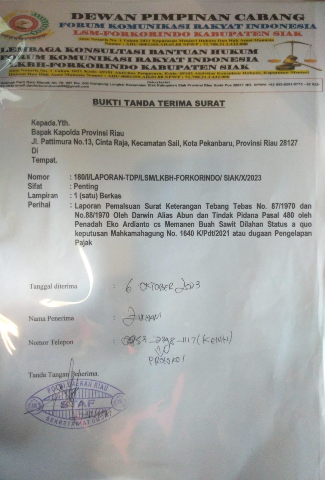 “Kami LSM Forkorindo Kabupaten Siak yang diberikan kuasa oleh masyarakat, pada hari ini melaporkan secara resmi saudara Darwin alias Abun dkk Atas dugaan sebagai mafia tanah, serta saudara Eko Ardianto sebagai penadah buah sawit pada lahan sengketa yang berstatus quo sesuai putusan Mahkamah Agung Republik Indonesia,” jelas Syahnurdin yang didampingi Sekjen DPP LSM Forkorindo