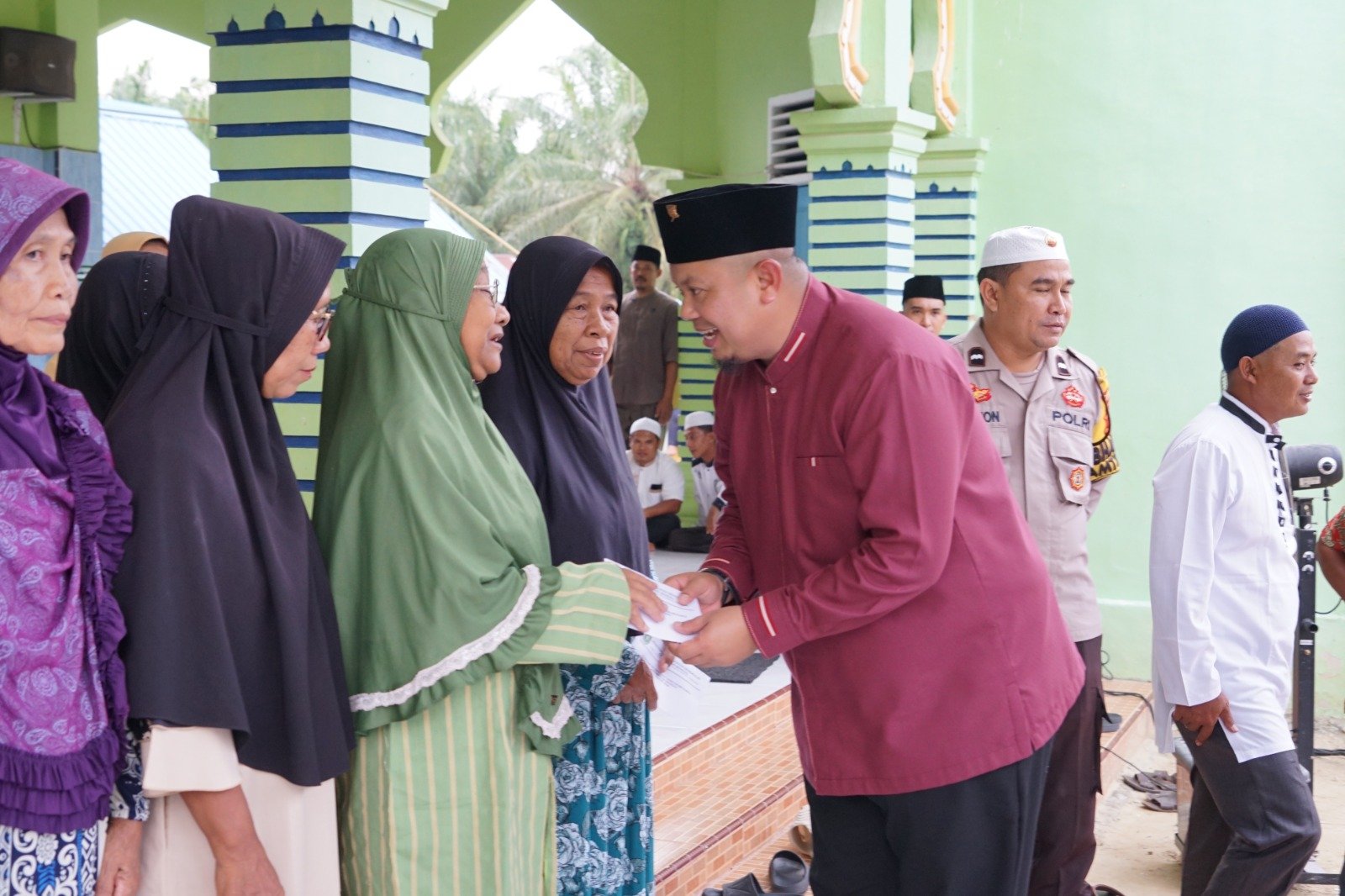 Setelah sambutan, kegiatan dilanjutkan dengan penyerahan santunan kepada Anak Yatim dan Kaum Dhuafa yang ada di sekitar Masjid, serta penyerahan secara simbolis bantuan Al-Qur’an dan Buku Yasin kepada Masjid Baitul Ibadah Desa Bathin Betuah.