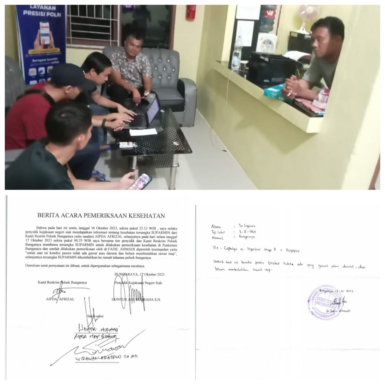 Kejari Siak, Tri Anggoro Mukti, bersama anggotanya Senin malam turun ke Mapolsek Bungaraya membawa Suparmin memeriksakan kesehatannya di Puskesmas Kecamatan Bungaraya, dari hasil pemeriksaan dokter, Suparmin di nyatakan sakit ringan, namun tidak harus dirawat di rumah sakit.