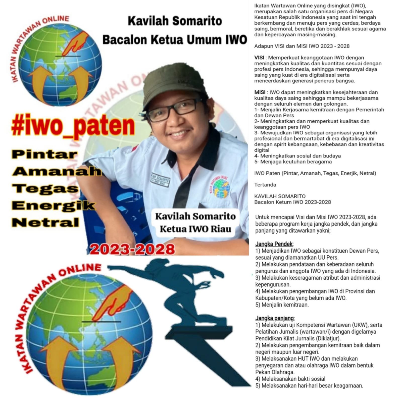 Selain itu, ia juga mengungkapkan bahwa dalam Visi dan Misi nya untuk IWO dalam kurun waktu 5 tahun ke depan dengan harapan IWO Jaya dan bermarwah serta berakhlak dengan mengedepankan kekompakan antar insan pers.