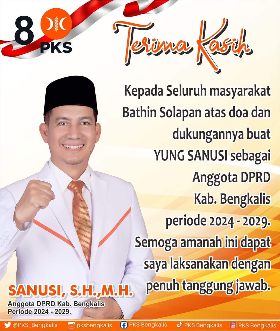 BENGKALIS – Pelantikan anggota DPRD Kabupaten Bengkalis sudah selesai dilakukan pada Selasa (17/9/24). Wajah-wajah baru menghiasi DPRD Kabupaten Bengkalis periode 2024-2029. Namun banyak juga caleg incumbent atau petahana yang masih tetap menjadi anggota DPRD Kabupaten Bengkalis pada kali ini. Salah satunya adalah Sanusi, S.H., M.H. Caleg dari partai PKS ini kembali duduk di DPRD untuk periode kedua ini.