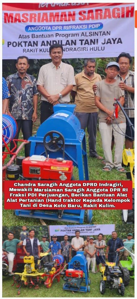 Harapannya, semoga bantuan yang sudah di berikan ini dapat segera di gunakan dan menjadi manfaat buat kelompok tani di Desa Kota Baru, serta bisa meningkatkan ekonomi untuk kelompok tani tersebut, “Demikian jelas Chandra Saragih, anggota DPRD Inhu Bacaleg DPRD Provinsi Riau, Politisi PDI Perjuangan Dapil Indragiri dan Kuansing.