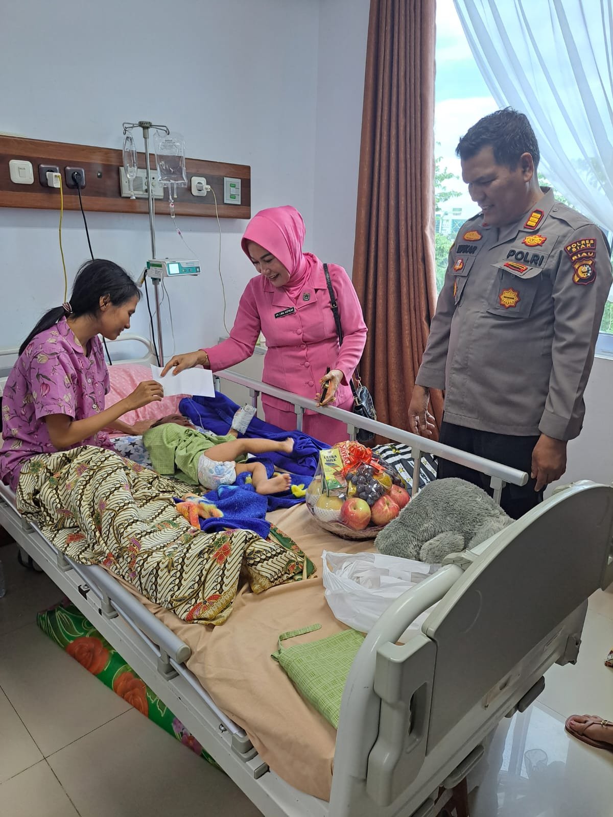 Kapolsek Bungaraya AKP. Aspikar beserta Isteri Saat menjenguk Korban Lakalantas Tunggal, Korban Seorang Bayi yang masih Balita dengan kondisi salah satu tangannya sudah putus, di RS Prima Pekanbaru (23/11/2023)