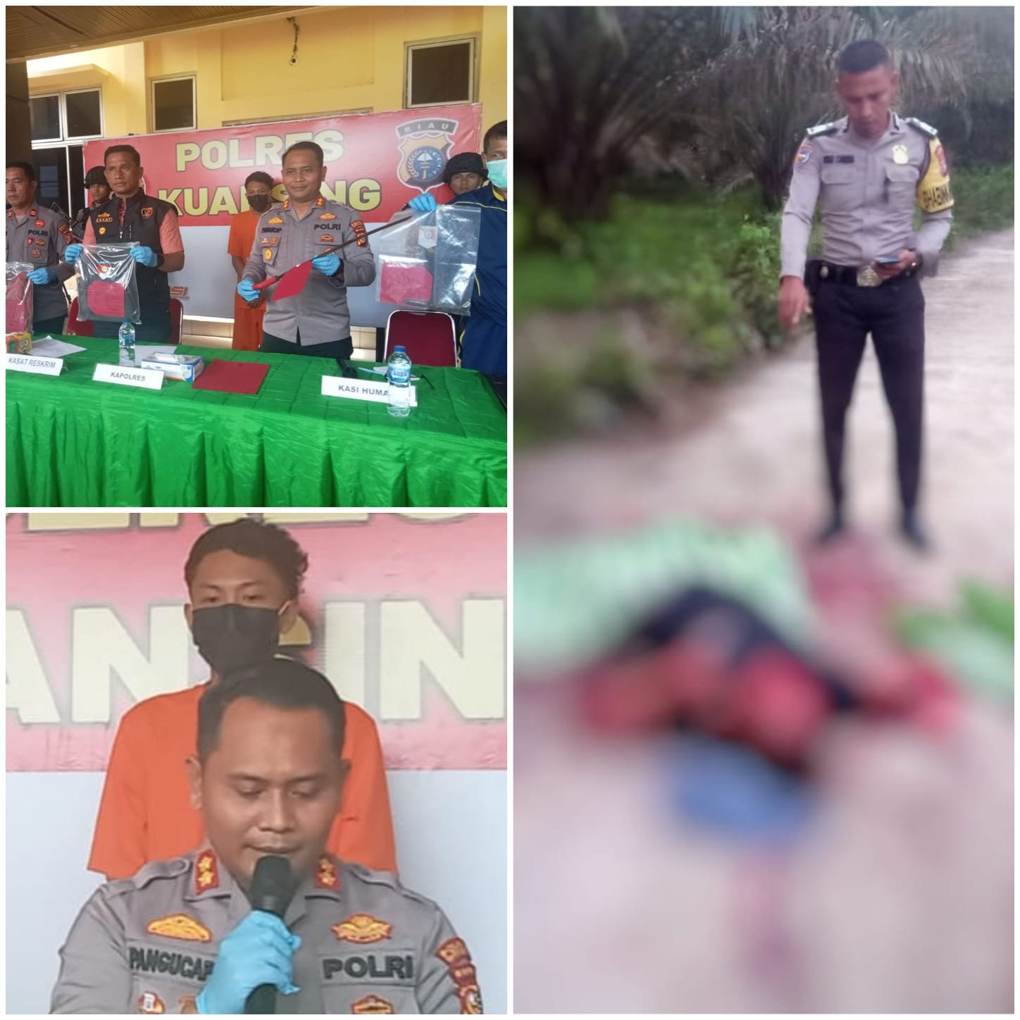 | Photo Kapolres Kuansing AKBP Pangucap Priyo Soegito, S.I.K, M.H saat Konferensi pers dan Tersangka memakai baju orange beserta barang bukti baik dari tersangka maupun dari korban |