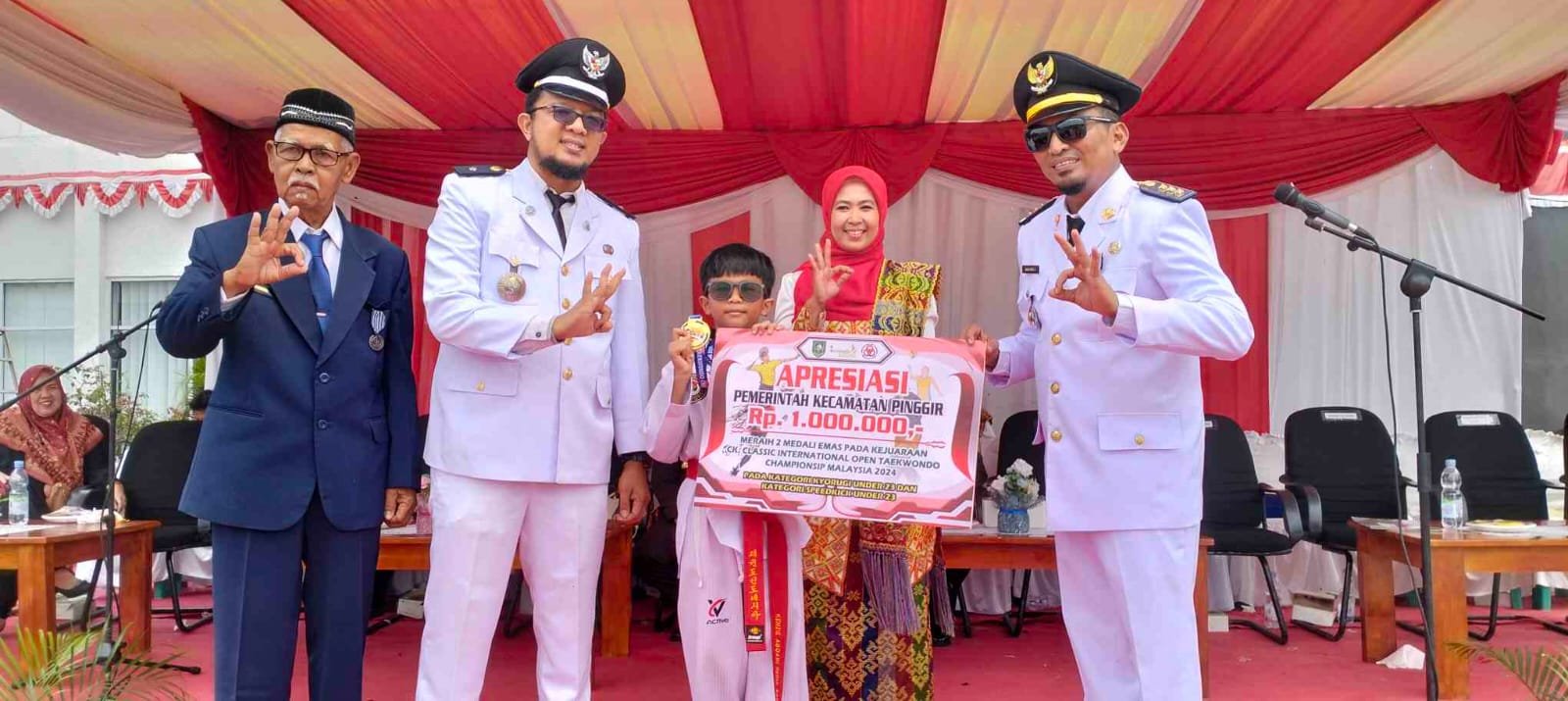 “Pada moment HUT RI ke-79 tahun 2024 ini,kami dari Pemerintah Kecamatan Pinggir menyampaikan ucapan selamat sekaligus memberikan penghargaan dan apresiasi kepada ananda Kenzie Abaqari Redia Sakhi(9) putra dari lurah Titian Antui Redho Naslin lurah dan Diana Daztian yang telah mengharumkan nama Indonesia khususnya Kecamatan Pinggir Kabupaten Bengkalis diajang Great Achievemensin 16th Classic Internasional Open Taekwondo di Malaysia.