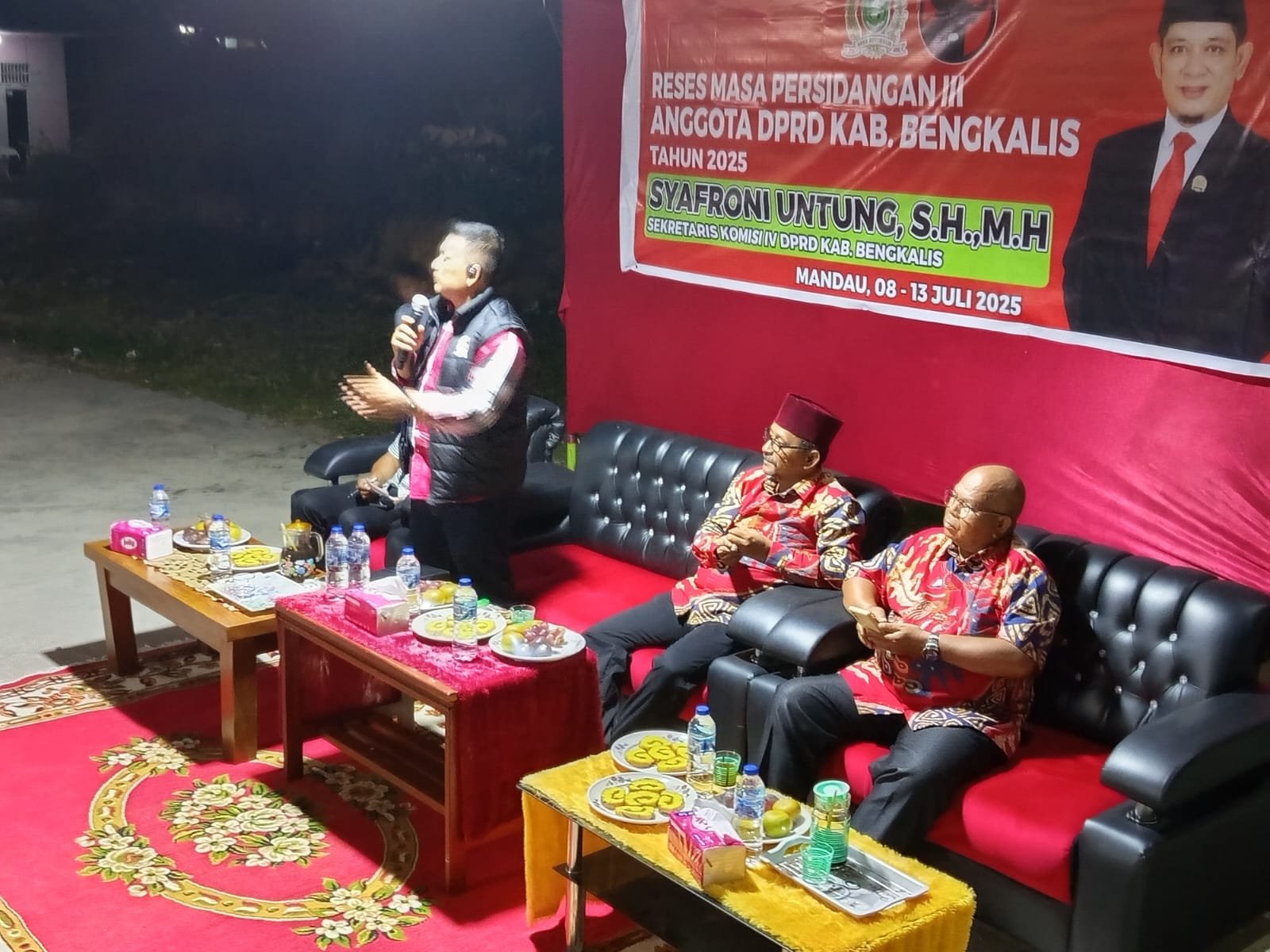 Dalam penyampaian resesnya, Syafroni Untung, S.H., M.H dirinya membahas berbagai sektor, seperti pendidikan. Dimana hal pendidikan ini yaitu tentang beasiswa, juga dirinya menyampaikan tentang program kesehatan masyarakat lewat program Pemerintah Kabupaten Bengkalis. Selain itu, hal insfratruktur juga menjadi pembahasannya.