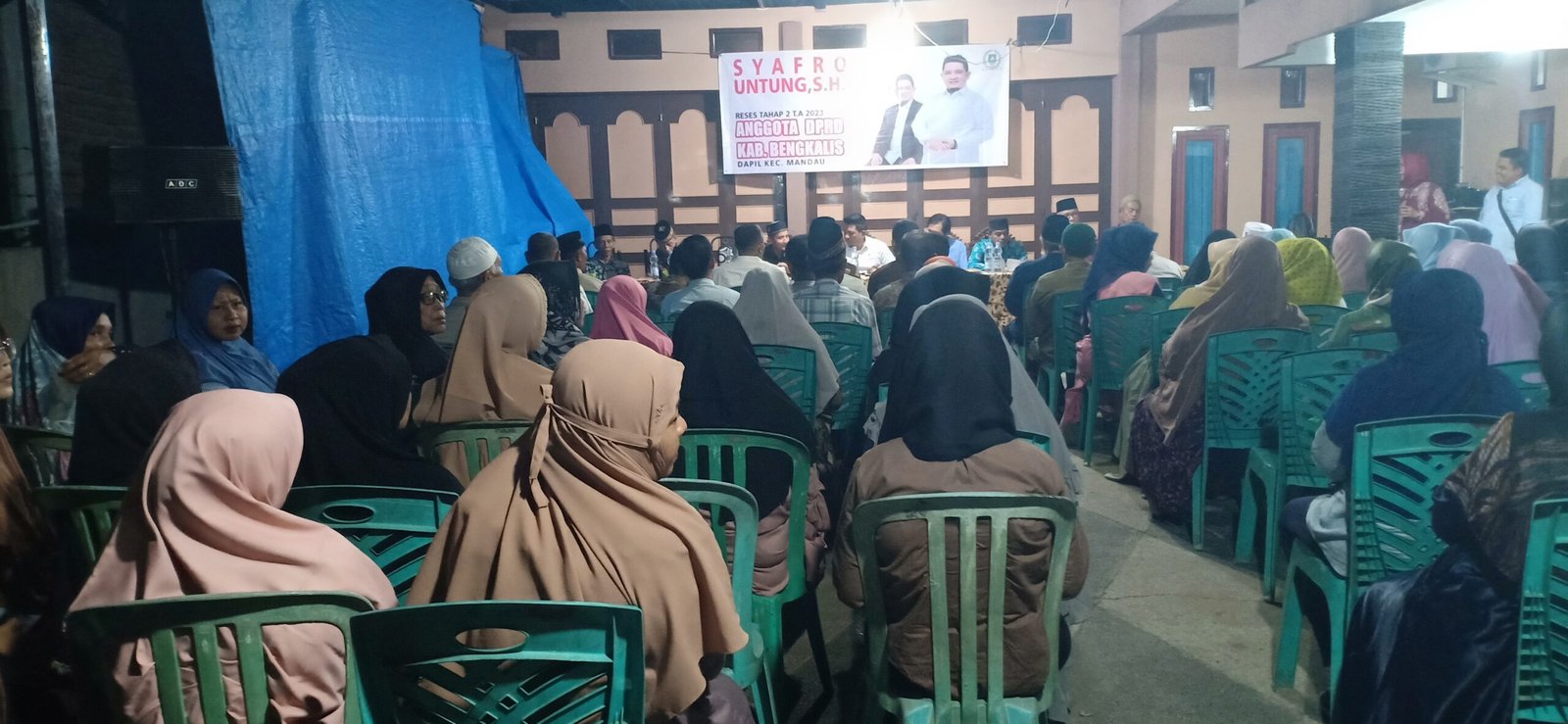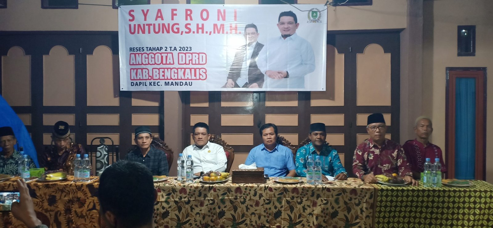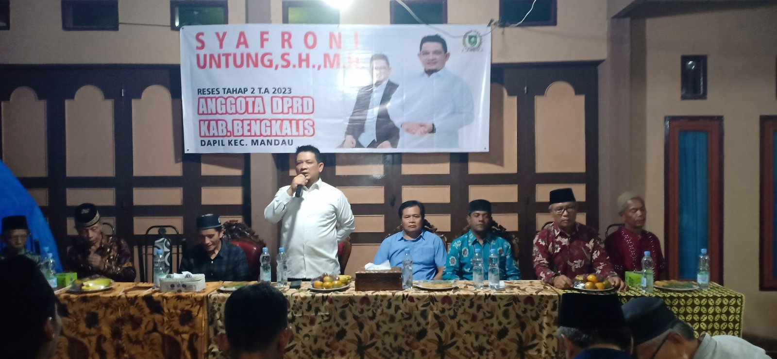 DURI – Dalam kegiatan reses Anggota DPRD Kabupaten Bengkalis Syafroni Untung, S.H., M.H melakukan kegiatan reses atau serap aspirasi di Kelurahan Air Jamban, Tepatnya RT 02 RW 13 di Jalan Nusantara I Gang Durian. Reses ini merupakan reses di Titin terakhir beliau yang digelar pada Rabu malam (26/7/23).