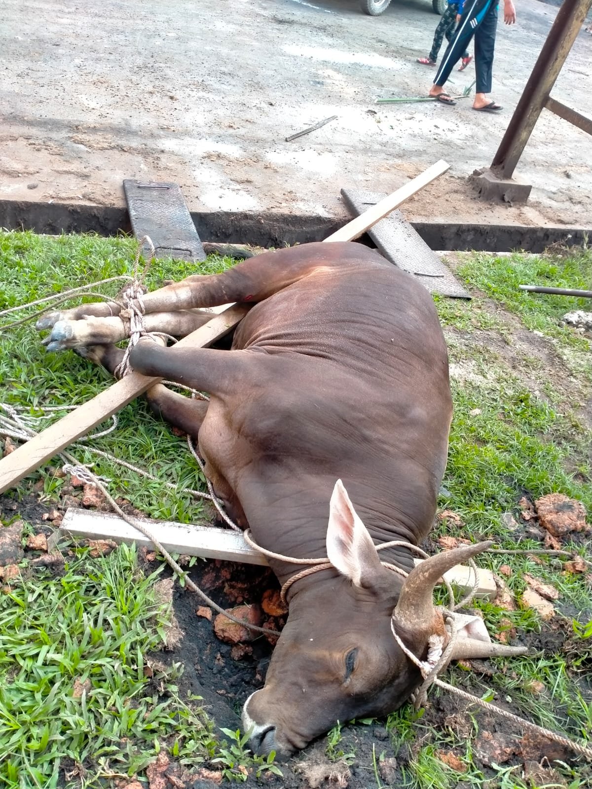 Kegiatan pemotongan hewan qurban dilakukan secara bergandengan oleh masyarakat. Begitu juga dengan pemotongan hewan qurban yang ada di perusahaan. Para karyawan bersama-sama memotong hewan qurban. (Bn)
