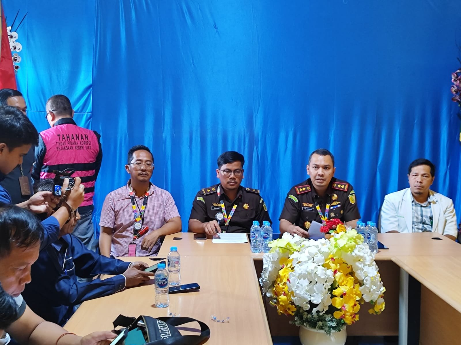 Kepala Kejari Siak Tri Anggoro Mukti beserta Kasi Intel saat Konferensi Pers, terlihat berbaju orange Suparmin tersangka Kasus Korupsi penyimpangan dalam pendistribusian Pupuk Bersubsidi di Kecamatan Kerinci Kanan Kabupaten Siak saat di amankan pihak Penyidik Kejari Siak (4/10/2023)