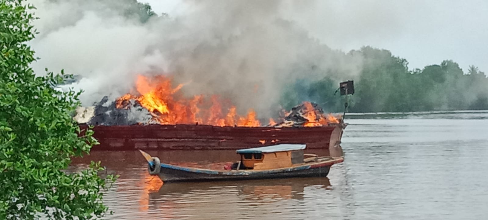 | Kapal KM. Jaya Mulia Sakti yang membawa berbagai Sembako saat terbakar di Sungai Siak Kampung Teluk Mesjid Kec.Sungai Apit (22/07/2023) |